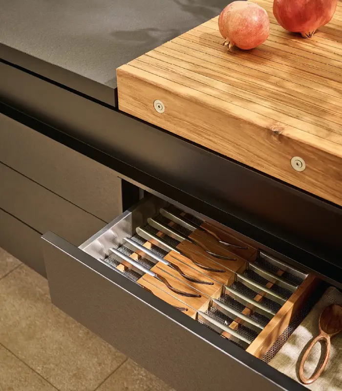 Land kitchen, bridge structure in mat black lacquered aluminium with hanging storage units, structure in steel and sides in black stratified laminate. Drawers and pull-out baskets with fronts in Inalco MDi® carbone, sides in mat black lacquered aluminium. To the left, top in steel with squared drip edge and sink, folding mixer; to the right, top with steel containers, both with covers in Inalco MDi® carbone and black painted frame. Counter in solid teak slats with steel tie rods. Barbecue Flamkraft in satin steel with handle in solid teak. Inner drawer equipment in teak and steel.