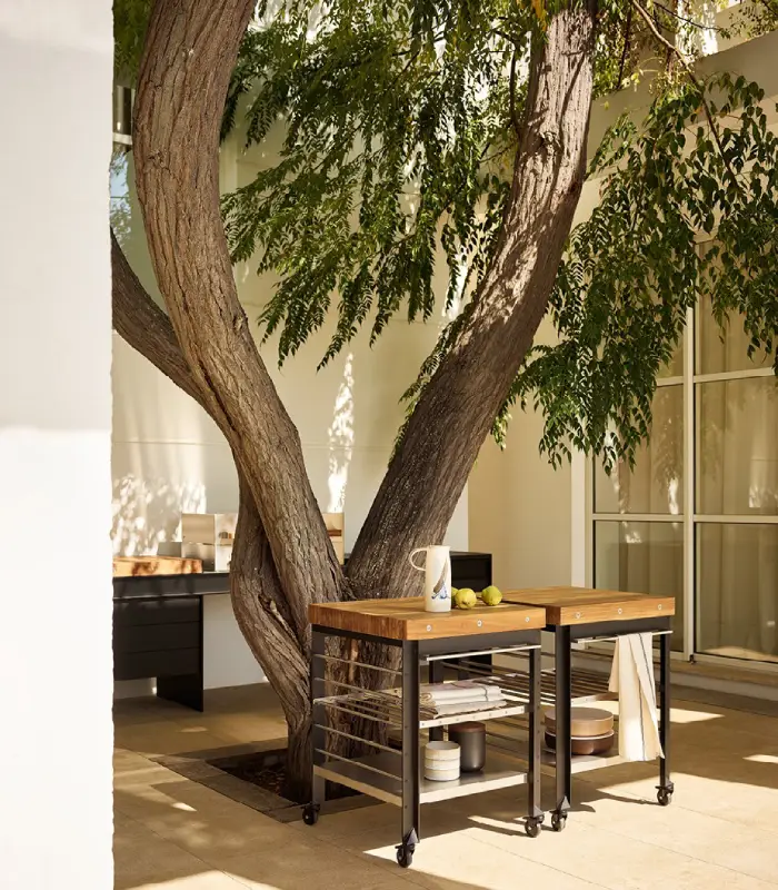 Poliform’s first outdoor kitchen, designed in collaboration with CAP., consists of a series of modules hooked on longitudinal beams that make it look suspended. Linear and essential, it is available in two versions: wall or freestanding, and made of aluminium, Inalco MDi and steel, materials suitable for outdoor use. The outdoor kitchen does not need any electrical connection, because all the functions are powered by gas or battery, and it is equipped with a sink, cutting board and barbecue.