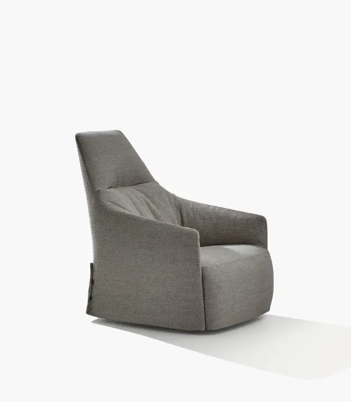 The elegance of the Santa Monica collection is also reflected in the Lounge version of the armchair, with a high back and coordinated pouffe. Upholstered in fabric or leather, it is enriched by sartorial details such as the folded back with frog fastenings, the cord stitching and the grosgrain edging.